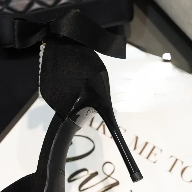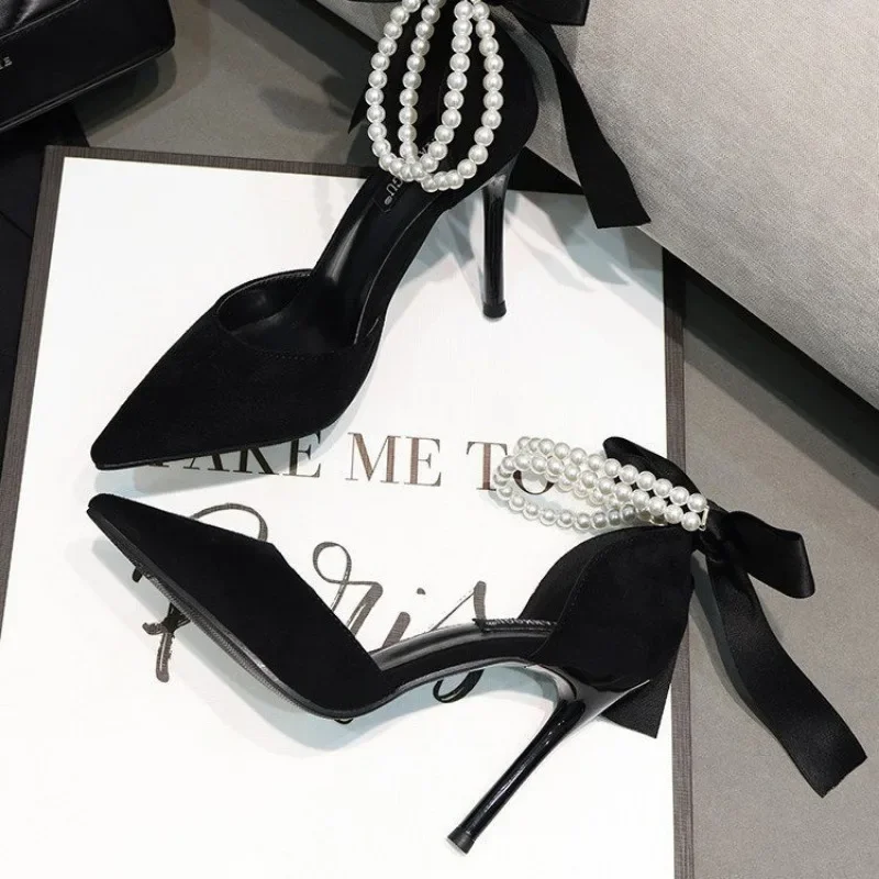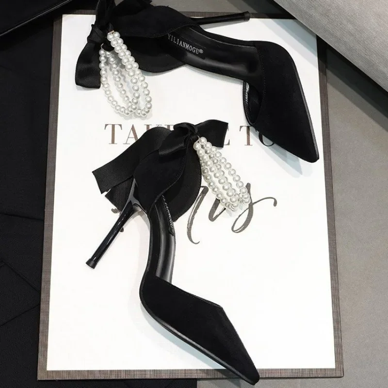Black Women’s Pumps Summer New Brand Design String Bead Pearls Wedding Bridal High Heels Sexy Pointed Toe Party Dance Shoes