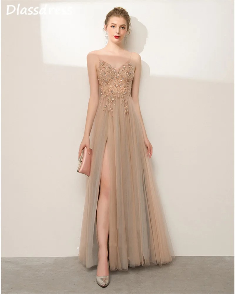 Champagne A-Line Evening Dress | Spaghetti Strap Beaded Sequin Illusion Top Split Floor-Length Prom Gown