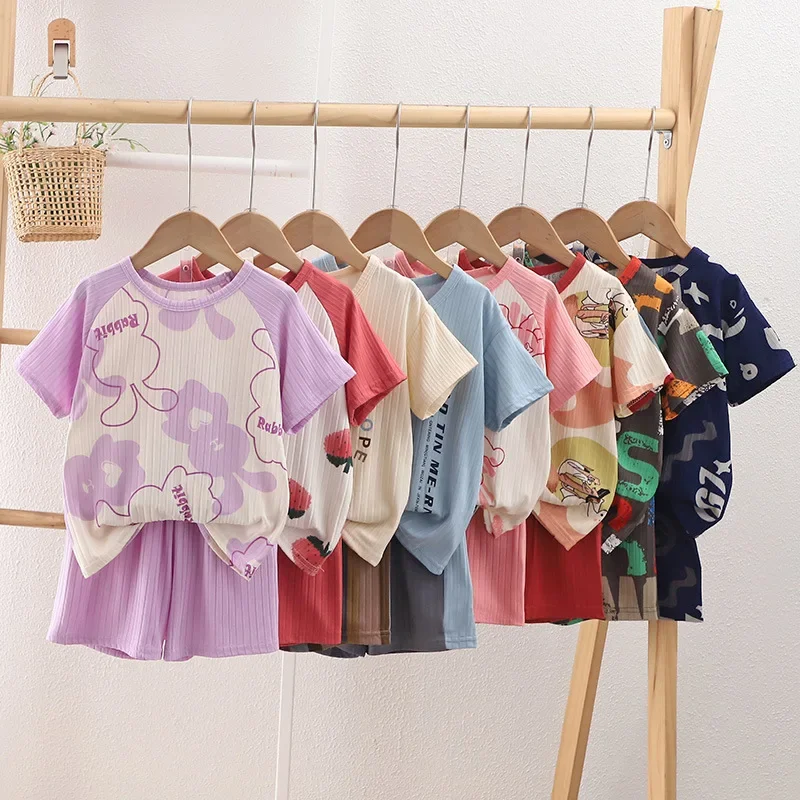 Children’s Ice silk Pajama Set Summer Thin Short Sleeve Shorts Ice Silk Suitable For Boys Girls Homewear Set 4 6 8 9 16 Years