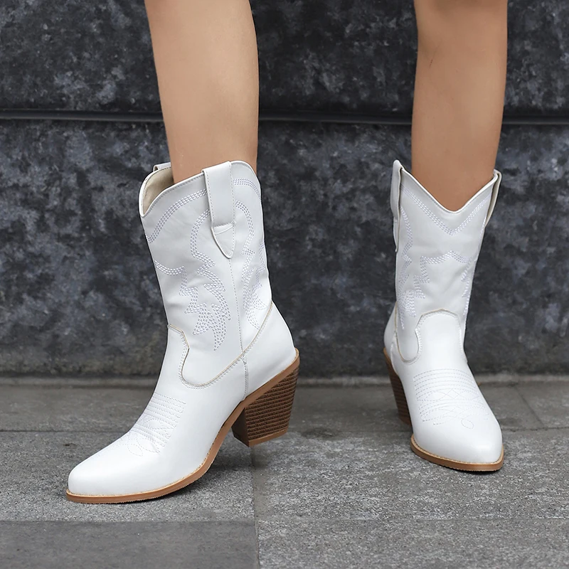 Fashion Cowboy Ankle Boots For Women Vintage Sewing White Short Boot Ladies Block High Heels Winter Party Shoes Large Size 45