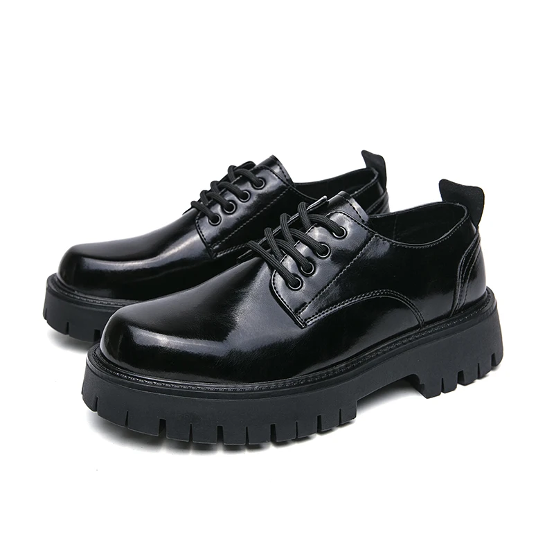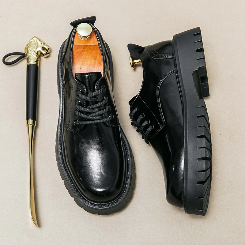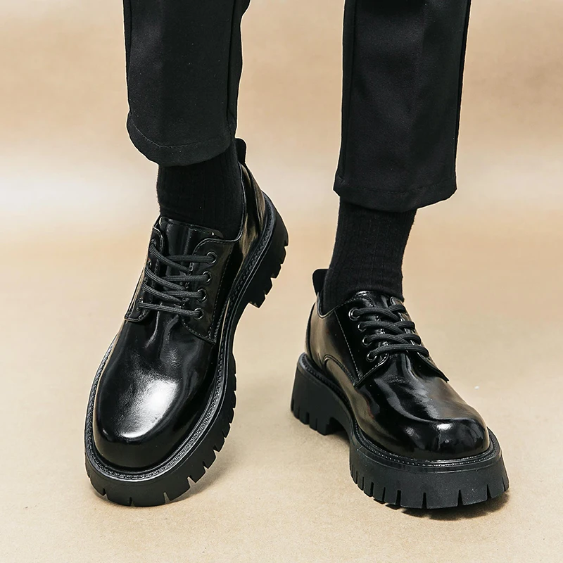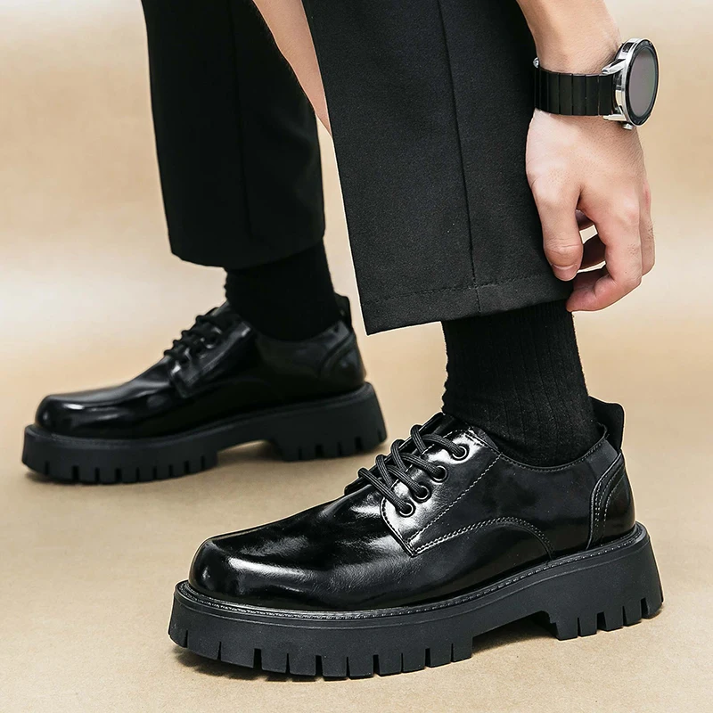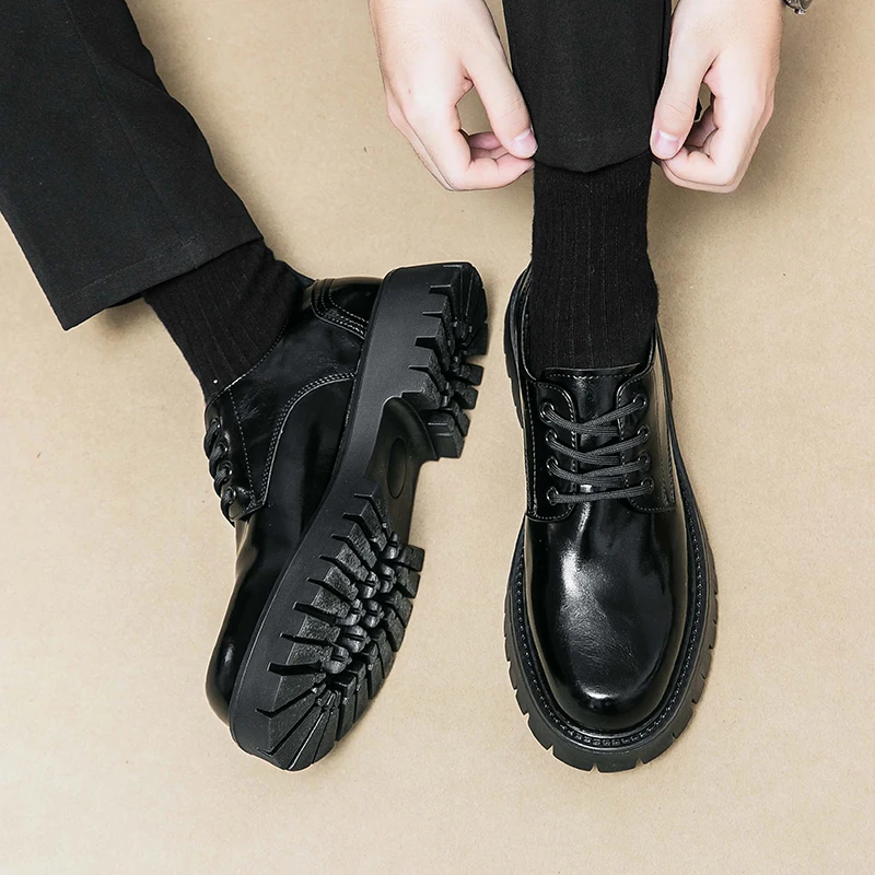 Men Korea Leather Platform Oxfords Lace Up Thick Tottom For Male Derby Shoes Casual Loafers Mens Square Toe Formal Dress Shoes